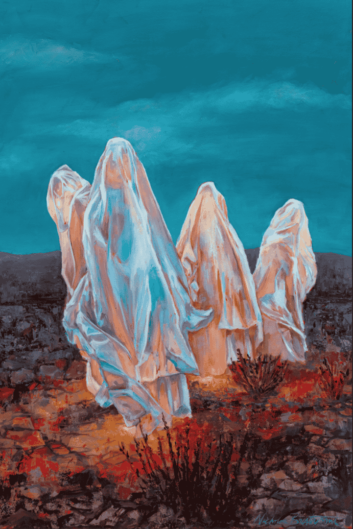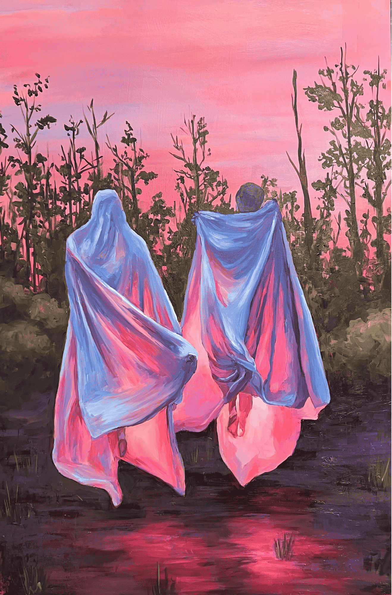 Through layered processes of scumbling, glazing, and selective excavation, Bustamante creates surfaces that feel less painted than unearthed, allowing earlier gestures to glow through like memory itself. Draped figures, empty garments, and liminal landscapes suspended between dusk and dawn embody a state of perpetual transition—neither fully grounded nor entirely untethered. Textiles function as visual genealogies, familiar yet unsettled, suggesting that legacy persists even when physical presence fades. These works offer no resolution. Instead, they hold viewers within the tension of coexistence, insisting that we are always negotiating what we inherit, what we choose, and what we release. In Then and Now and Always, nothing is fully buried, nothing entirely escapes; everything remains.